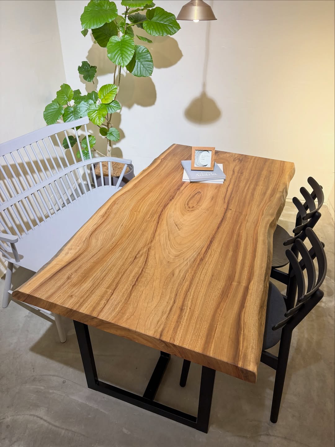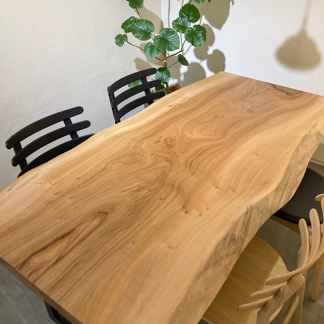 楠は、ナチュラルな風合いでインテリアにも自然に馴染み、空間全体にやさしいぬくもりをもたらします。リラックス感ある空間づくりに最適な一枚板となります。中間的なカラーリングで、チェア、専用脚の組み合わせ方では様々なインテリアシーンに合わせやすい色です。